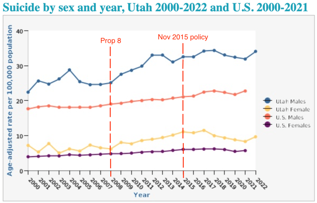 A visual representation of this data hints at a pattern. Below is a graph taken from Utah’s Public Health Data Resource. The vertical dotted red lines are not part of the original but rather my own insertion to possibly give more context and meaning to the sharp rises in suicide rates after Prop 8 passed and the Nov 2015 policy was enacted.