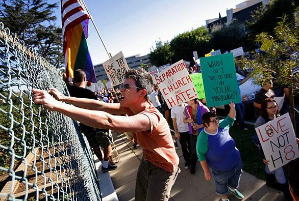 Protesters outside the Los Angeles, California LDS Temple in Nov 2008